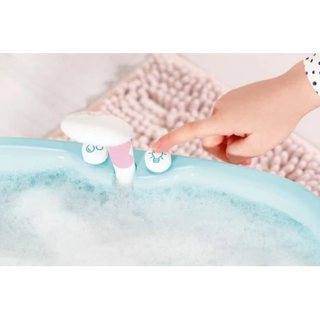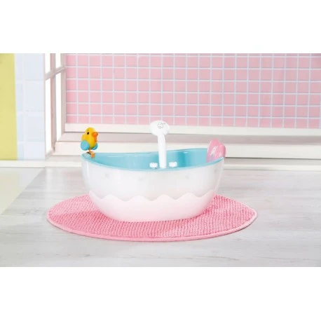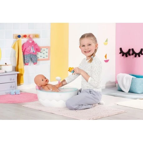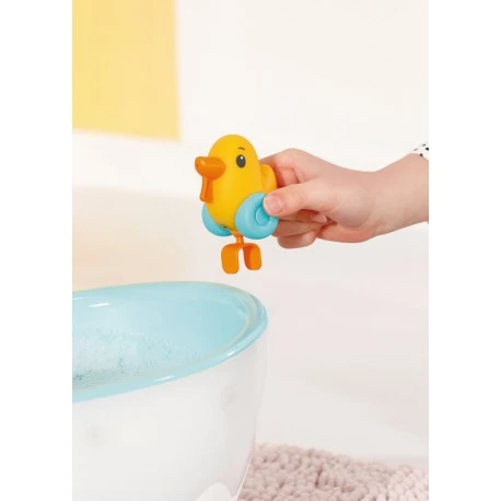 Zielen, Drücken uuuuund… GETROFFEN! Der Brother ist ordentlich nass geworden. Mit so einer Badeente kann man eine prima Wasserschlacht veranstalten. Die kann in allen möglichen Positionen am Badewannenrand positioniert werden genauso wie das herzige Kissen. Die Wanne ist im Inneren Wasserblau und außen Weiß mit eingearbeiteter Wellenform. Wird der Lichtschalter neben der Brause gedrückt, leuchtet die Außenhülle der Badewanne abwechselnd in verschiedenen Farben. Der Duschknopf aktiviert die weiß-rosa Brause. Ist die Badewanne dabei leer, sind Plätschern und typische Wassergeräusche zu hören. Wurde vorher Wasser hineingefüllt, läuft es nun durch den Duschkopf. Dieser kann in Richtung Wanne geneigt werden, damit kein Tropfen daneben geht. Der Schlauch kann aber auch herausgezogen werden, um BABY born gründlich abzuduschen oder dem Brother noch eine weitere Ladung Wasser zu verpassen. Hochwertiges Zubehör für die BABY born Markenspielpuppe. Für erweitertes, abwechslungsreiches und langanhaltendes Spielvergnügen. Für Puppen in 36cm und 43cm geeignet. Batterien erforderlich (nicht im Lieferumfang enthalten). BABY born Bath Badewanne mit Licht- und Sound-Effekten. Inklusive Kissen und Spritz-Ente..