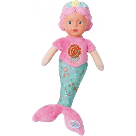 “Wer steigt denn da fröhlich aus dem Kissen-Meer empor? Die kuschelige Meerjungfrau hat einen weichen Stoffkörper. Das Oberteil mit Algenstickerei und die rosa Flossen sind aus dem gleichen plüschigen Stoff. Der türkise Schwanz ist mit natürlichen Drucken versehen. Ihr softer Kopf aus Vinyl ist mit pinken Haaren verziert. Die Zöpfe erinnern an Seeigel. Einige blühende Wasserpflanzen haben sich als Blumenkranz in der Frisur verfangen. Und falls die Meerjungfrau mal einen Tauchgang in der Abendmilch gemacht hat, kann sie problemlos bei 30°C gewaschen werden. •.