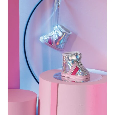 ‚BABY born tritt ins Spektrum der coolsten Schuhe ein. Man sieht die holographischen Stiefelchen schon von Weitem funkeln. Seitlich sind die trendigen Treter mit Streifen in pink und rosa verziert. Gut verschnürt und mit Klettverschluss befestigt, kann BABY born damit bis zum Mond laufen. Hochwertige Kleidung für die BABY born Markenspielpuppe. Für erweitertes, abwechslungsreiches und langanhaltendes Spielvergnügen. Kinderleichtes An- und Ausziehen. BABY born Sneakers pink 43cm.“.