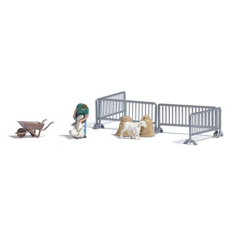 Action Set für die realistische Belebung Ihrer Modellwelt. Schafscherer, der ein Schaf schert und ein geschorenes Schaf. Mit Schafpferch sowie Schubkarren und Säcken für die Schafwolle..