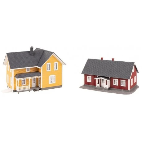 Schwedisch! Set bestehend aus einem einstöckigen Wohnhaus in roter Farbgebung mit Vordach, weißen Giebelfenstern und Schieferdach sowie einem zweistöckigen, gelben Wohnhaus mit mittigen Hausanbau. Der seitliche Hauseingang ist überdacht und auf der Rückseite des Gebäudes befindet sich eine typisch schwedische Eingangsveranda..