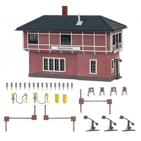 Zweigeschossiges Stellwerksgebäude in Ziegelbauweise. Für die Außenausschmückung liegen drei Weichenstellhebel, Tremolo, Hektometersteine und eine Zugvorheizanlage bei..