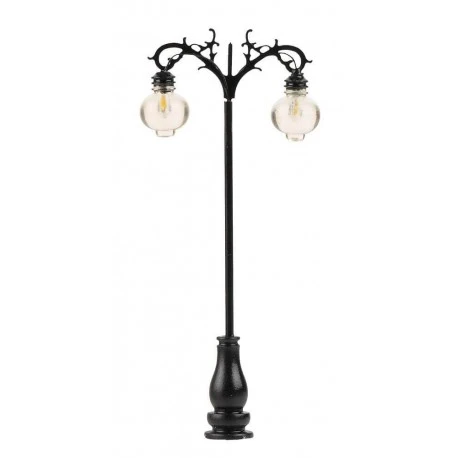 Modell einer historischen, schmiedeeisernen Hängeleuchte. Die filigran ausgeführten Verzierungen verleihen dieser Leuchte besonderen Charme. Damit eignet sie sich im besonderen Maße zur Beleuchtung von Altstädten, Parks und historischen Szenerien. Der Mast ist aus Metall gefertigt und die Leuchtenhöhe variabel einstellbar. Die zweiflammige Hängeleuchte ist mit langlebiger LED-Technik ausgestattet. Höhe: 75 mm. Das Produkt ist anschlussfertig für 12 V Gleichspannung (DC). Nutzen Sie für den Betrieb der Leuchte den Transformator, Art. 180641..