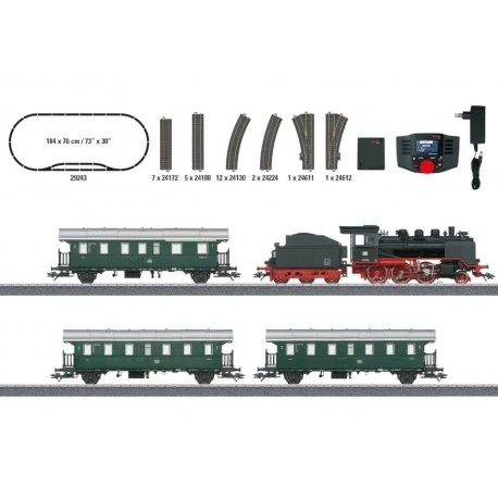 Modell: Schlepptender-Lokomotive mit Digital-Decoder mfx und umfangreichen Geräuschfunktionen. Spezialmotor im Kessel. 3 Achsen angetrieben , Haftreifen. Kessel und Fahrwerk aus Metall gefertigt. Fahrtrichtungsabhängig wechselndes Dreilicht-Spitzensignal konventionell in Betrieb, digital schaltbar. Beleuchtung mit warmweißen Leuchtdioden (LED). Kurzkupplung mit Kinematik zwischen Lok und Tender. Hinten am Tender kinematikgeführte Kurzkupplung mit NEM-Schacht. Vorne an der Lok Kurzkupplung im NEM-Schacht. Rauchsatz 72270 nachrüstbar. Alle Wagen mit kulissengeführten Kurzkupplungen.Länge des Zuges 67,4 cm.Inhalt: 12 gebogene Gleise 24130, 7 gerade Gleise 24172, 5 gerade Gleise 24188, 2 gebogene Gleise 24224 und 1 Paar Weichen 24611 und 24612. Gleisanschlussbox, Schaltnetzteil 230 V/36 VA und Mobile Station. Illustriertes Spielbuch mit vielen Tipps und Anregungen. Erweiterungsmöglichkeiten mit den C-Gleis-Ergänzungspackungen und mit dem gesamten C-Gleis-Programm..