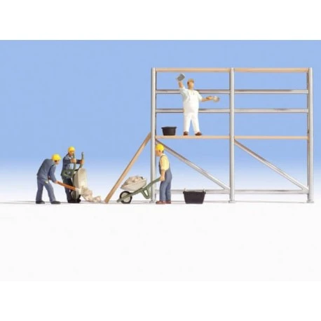 Maurer mit Gerüst bei der Arbeit.Das Set enthält vier Modellfiguren, ein Baugerüst und weiteres Zubehör. Ein Maurer schiebt eine Schubkarre, ein weiterer Maurer entleert seine Schubkarre. Ein Arbeiter steht auf dem Gerüst und bringt Mörtel auf. Der vierte Maurer arbeitet mit der Schaufel.Die schönen H0 Figuren (Maßstab 1:87, Figur ca. 2 cm hoch) sind aus Kunstsoff und handbemalt. Die Modellfiguren sind ideal für Handwerks- und Bauszenen auf Modellbahnanlagen und in Dioramen geeignet..