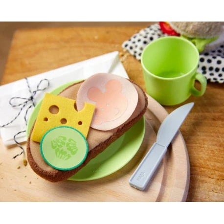 Das Frühstücks-Set Start in den Tag von HABA bringt alles mit, was Kinder ab 3 Jahren für ein Morgenmahl in der Spielküche brauchen: eine Scheibe Brot mit Käse, Gurke und Wurst zur Auswahl, zum Kombinieren und Stapeln. Die Spielzeug-Lebensmittel bestehen aus Stoff und sind mit witzigen Details besonders lebensnah gestaltet. Ideal für den Kaufladen und die Kinderküche! Das Spielzeug-Geschirr aus robustem Kunststoff kann auch für richtiges Essen und Trinken verwendet und in der Spülmaschine gereinigt werden. Das Spiel-Messer mit abgerundeten Kanten macht das HABA Kinderküchen-Zubehör komplett..