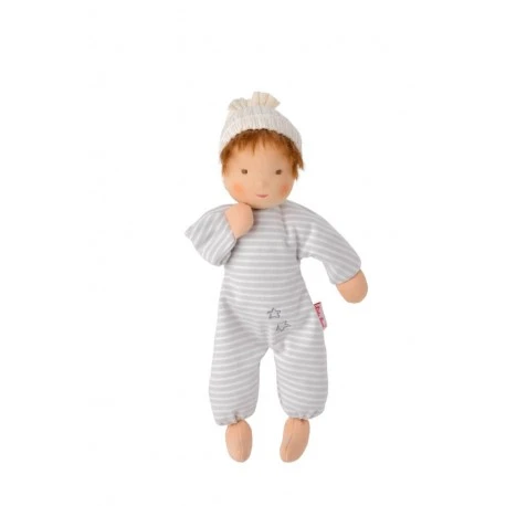 Schatzi ist eine kuschelig weiche Waldorfpuppe aus Naturmaterialien. Der Körper ist aus Baumwolltrikot gefertigt, das Gesicht nach Waldorf-Art minimalistisch handgemalt. Gefüllt ist die Puppe mit Schafwolle. Die Mütze ist mit dem Kopf fest vernäht, darunter schauen weiche Mohair Haare hervor..