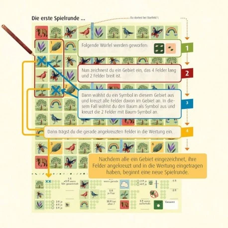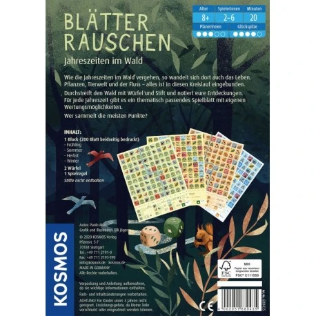Roll & Write durch die Jahreszeiten! Würfelnd sehen die Spieler dabei zu, wie sich der Wald im Laufe eines Jahres verändert. Von der Knospe bis zum letzten Blatt schon geht es wieder von vorne los. Für Frühling, Sommer, Herbst und Winter gibt es in diesem Spiel ein passendes Spielblatt mit jeweils anderen Regeln. Die Augenzahlen der Würfel geben die Größe der zu markierenden Felder vor. Jetzt ein Wald-Symbol auswählen, das in die Punktwertung einfließt. Wer die meisten Punkte sammelt, gewinnt. Ein stimmungsvolles Würfelspiel für SpielerInnen ab 8 Jahren..