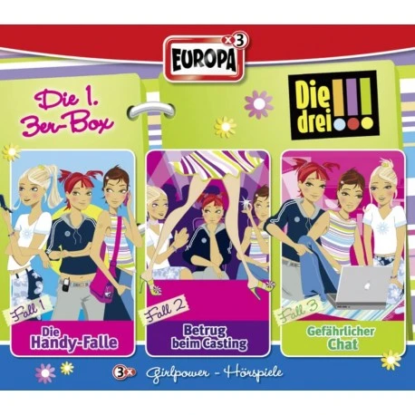 Folge 1: Die Handy-Falle: Mitternacht. Ein gespenstisches blaues Leuchten dringt durch die Bäume hinterm Haus. Seltsame Schatten bewegen sich im Garten. War das der Ruf einer Eule – oder wimmert ein menschliches Wesen im Wald? Geister, Monster oder Hexen gibt es nicht – davon waren die drei Detektivinnen Kim, Franziska und Marie immer überzeugt. Bis ihnen die unheimlichen Gestalten im Wald gegenüberstehen … Neben der spannenden Detektivarbeit müssen Kim, Franziska und Marie auch immer wieder das Abenteuer Freundschaft bestehen. Es ist nämlich gar nicht so leicht, drei völlig verschiedene Meinungen unter einen Hut zu bringen. Mutig und clever stellen sich Die drei !!! der Herausforderung und sind gemeinsam ein unschlagbares Team! Folge 2: Betrug beim Casting: Die ganze Schule ist im Casting-Fieber. Doch dann fällt die Jury eine äußerst ungewöhnliche Entscheidung. Die drei !!! wittern einen neuen Fall … Folge 3: Gefährlicher Chat: Welche Gefahr sollte schon von einem Chat im Internet ausgehen? Die drei !!! erfahren es schnell – und müssen ihr ganzes detektivisches Wissen in diesem kniffligen Fall anwenden….