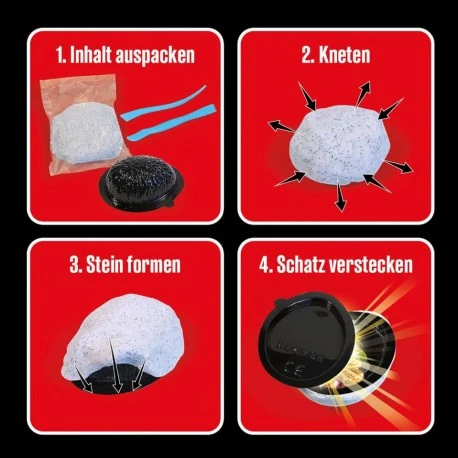 Einen sichereren Ort für streng geheime Botschaften, einen Schlüssel oder einen wertvollen Schatz gibt es nicht! Das „Die drei ??? Geheimversteck verbirgt sich an der Unterseite eines Steins aus lufttrocknender Knetmasse. Bevor das Detektivspiel beginnt stellen Nachwuchs-Detektive ab 8 Jahren selbst ihr ganz eigenes Versteck selbst her: Die Kinder drücken die Knetmasse auf eine Form und modellieren den Stein möglichst realistisch. Unauffällig bleibt er so vor neugierigen Augen im Kinderzimmer oder Garten verborgen. Einfach der anschaulichen Anleitung folgen, die zeigt, wie sich der Stein mit dem Modellierwerkzeug bearbeiten lässt und das Geheimfach geschlossen wird. Justus, Peter und Bob wären begeistert: Dieses Versteck findet garantiert keiner!.