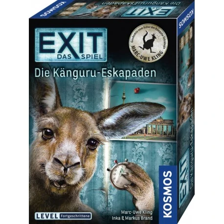 Neues aus der Erfolgsreihe „EXIT® – Das Spiel! Dieses Mal wird´s clever, witzig und frech, denn bei den Känguru-Eskapaden dreht sich alles um das lustige Beuteltier, bekannt aus den „Känguru Chroniken des Bestsellerautors Marc-Uwe Kling. In diesem Escape-Room-Spiel für zu Hause müssen die sogenannten Schnuffies den Aufnahmetest ins Asoziale Netzwerk schaffen. Das ist gar nicht so einfach, weshalb bei diesem Spiel für Erwachsene besonders Teamgeist und eine Portion Querdenken gefragt ist. Ein ungewöhnliches EXIT Abenteuer mit Rätseln für Fortgeschrittene. Mit der Reihe „EXIT® – Das Spiel bringt KOSMOS das Gefühl der Live-Escape-Rooms zu euch nach Hause. Jede Box bietet einer Gruppe von 1 bis 4 Personen ein außergewöhnliches Spielerlebnis für einen einmaligen und absolut unvergesslichen Abend! Der Wettlauf gegen die Zeit und die cleveren Rätsel dieser innovativen Spielreihe sorgen für Spannung und geistige Herausforderung in den eigenen vier Wänden. Um die Rätsel zu lösen und sich somit gemeinsam aus der misslichen Lage zu befreien ist Teamgeist gefragt! Also arbeitet gut zusammen, denn die Zeit läuft… Live-Escape-Feeling im Fortgeschrittenen-Level. Inhalt: 1 Buch, 1 Poster, 1 Decodier-Scheibe, 19 Rätsel-Karten, 31 Lösungs-Karten, 30 Hilfe-Karten, 5 seltsame Teile, 1 Spielanleitung.