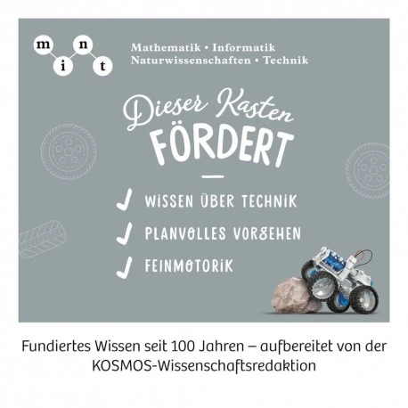 Mit ein paar Tropfen Wasser und Salz ein geländegängiges Fahrzeug antreiben? Na klar! Die Magnesium-Luft-Zelle macht es möglich! So kommt die Zukunfts-Technologie der Brennstoffzellen ins Kinderzimmer. Kinder von 8 bis 12 Jahren bauen den Truck nach der Anleitung zusammen und lernen dabei nicht nur, ein cooles Gefährt zu konstruieren – sie erleben auch, mit wie man ein Auto ganz emissionsfrei antreiben kann. Mit seinem Allrad-Antrieb und dem flexiblen Fahrgestell ist das Fahrzeug für jedes Gelände geeignet und meistert jedes Hindernis – ganz ohne Batterie. Wie Brennstoffzellen funktionieren? Das erklärt die spannend aufbereitete Anleitung. Mit dem Experimentierkasten von KOSMOS Technik spielerisch erleben – so geht Lernen heute!.