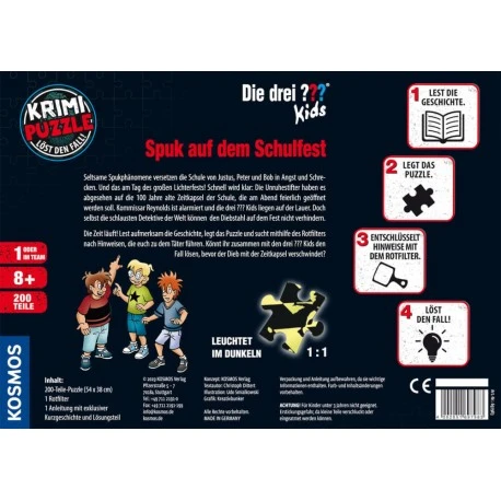 Kriminalfall Lesen, Leuchtpuzzle legen, Fall lösen Für alle Rätsel- und Puzzle-Fans! Diesmal haben es die drei ??? Kids mit einem höchst mysteriösen Fall zu tun und brauchen die Hilfe der Spieler. Nachdem diese die spannende Geschichte gelesen haben legen sie das Puzzle – Stück für Stück entsteht so vor ihren Augen der Tatort, an dem es nur so von Hinweisen wimmelt. Geniales Extra: das Puzzle leuchtet im Dunkeln und manche Indizien sind nur mit beiliegendem Rotfilter zu entschlüsseln! Inhalt: 200 Teile Puzzle (Format: 54 x 38 cm), 1 Rotfilter, Anleitung mit exklusiver Kurzgeschichte und Lösungsteil.