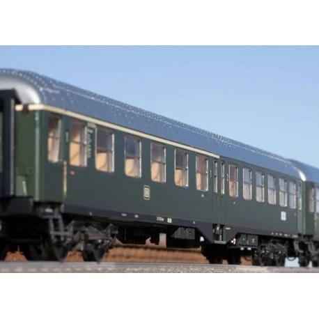 Vorbild: Reisezugwagen 1./2. Klasse der Deutschen Bundesbahn (DB) für sogenannte leichte Schnellzüge (LS). Bauart AB4ym(b)-51. Umgangssprachlich auch als äMitteleinstiegswagen“ bekannt. Ausführung mit stirnseitig oben liegenden kleinen Schlussleuchten und Übersetzfenstern an den Einstiegen am Wagenende. Farbgebung in Flaschengrün.