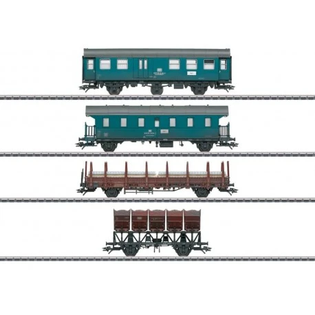 Vorbild: Vier Wagen unterschiedlicher Bauarten der Deutschen Bundesbahn (DB), zum Einsatz in Bauzügen. Ein 3-achsiger Umbauwagen als Wohn-Werkstattwagen 587, ein 2-achsiger Personenwagen als Wohn-Werkstattwagen 476, ein 2-achsiger Rungenwagen Kbs 443 und ein 2-achsiger Muldenkippwagen F-z 120. Betriebszustand um 1978. Modell: Beide Personenwagen in für Bauzüge typischer ozeanblauer Grundfarbgebung. Darstellung der Milchglasfenster, dazu werden Fenster teilweise von innen bedruckt. Rungenwagen mit Schwellen-Beladung. Rungen liegen separat bei. Kippmulden des Muldenkippwagens mit Schotter beladen. Alle Wagen leicht gealtert.Gesamtlänge über Puffer ca. 58 cm. Gleichstromradsatz E700580 und zusätzlich für 3-achsigen Umbauwagen E406240..