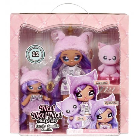 Das Na! Na! Na! Surprise Family Surprise bringt die erste komplette Na! Na! Na! Surprise Familie in einem einheitlichen Look. Teens-Puppe, Pom-Puppe und kleiner Tierfreund – alle sind im niedlichen Katzen-Look..