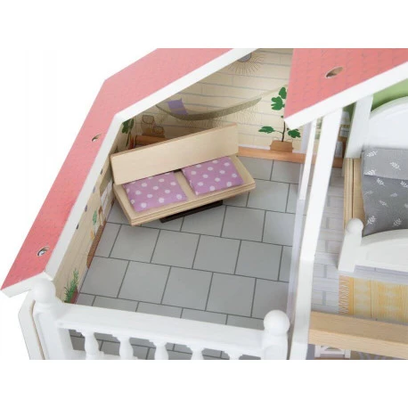 Dieses moderne Holz-Puppenhaus mit offener Front überzeugt durch gestalterische Details, dekorative Akzente und modernen Wohnstil. Wohnküche mit Esszimmer, Schlafzimmer und Bad sowie Dachterrasse und Vorgarten bieten alle Möglichkeiten für fantasievolles Spielen und aktives Rollenspiel. Das offene Wohnkonzept, die Wendeltreppe, zu öffnende Fenster und eine moderne, ebenerdige Dusche mit Acrylglas-Duschwand machen das Puppenhaus zusammen mit acht funktionalen Möbelstücken und Textilelementen wie Bettwäsche und Kissen zum Hingucker im Kinderzimmer. Highlights dieses kompakten Puppenhauses sind die große Dachterrasse mit Sitzgelegenheit und Geländer, die Toilette mit zu öffnendem Deckel sowie Küchenschränke und Kühlschrank mit Türen und Schubladen, die für ein besonders realistisches Spielvergnügen sorgen. Die Sitzbank und das breite Doppelbett verfügen über Sitzkissen und Bettwäsche aus Stoff, im Bad glänzt eine goldene Duscharmatur. Die Puppenhaus-Villa fügt sich dank heller Außenfassade und moderner Farbgebung perfekt in jede Wohn- oder Kinderzimmerumgebung ein. Die offene Front erleichtert es mehreren Kindern gleichzeitig, mit dem Puppenhaus zu spielen. Für bis zu 12 cm große Puppen geeignet.