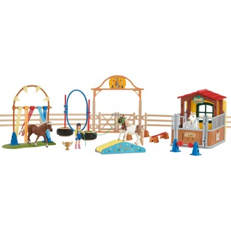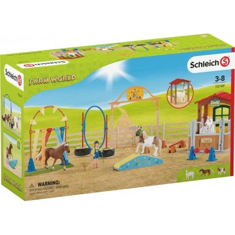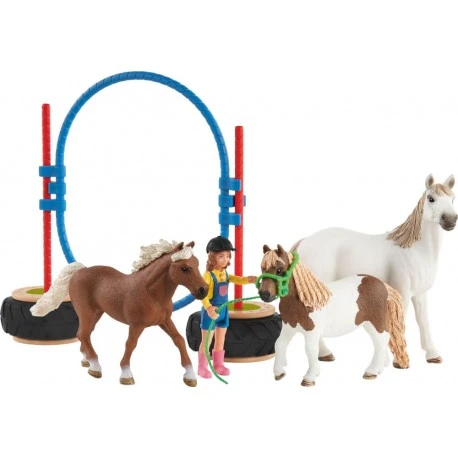 Agility bei der Pferdebox – Hindernisse beliebig zu gestalten – Für alle Schleich Pferde – Figur kann Arme und Beine bewegen – Wippe dient umgedreht als Brücke ca. 49 Teile Ab 3 Jahren..