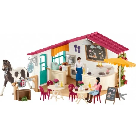 Im Schleich® Horse Club Reiter-Café bekommst du den leckersten Apfelkuchen weit und breit. Was könnte schöner sein, als ihn gemeinsam mit deinen besten Freunden aus dem Stall zu genießen? Und dank der offenen Terrasse kann auch dein Pferd dabei sein! Natürlich bekommt deine tierische Begleitung ihre leckere Schlemmerei in der Raufe serviert. Ob die wohl genauso gut schmeckt wie der Kuchen?.
