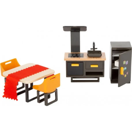 Komplettausstattung fürs Puppenhaus! Mit diesem umfangreichen Möbel-Set sind alle Räume im Puppenhaus stilvoll und modern eingerichtet. Das Mobiliar bestehend aus Kühlschrank, Herd mit Backofen, Waschbecken, Tisch und Stühlen, Bett, Nachtschränkchen, Stehlampe, Kleiderschrank, Sideboard mit Fernseher, Sofa, Couchtisch, Waschtisch, Dusche, Badewanne, Toilette, Spiegel und Waage lässt keine Einrichtungswünsche offen. Da fühlen sich die drei enthaltenen Spielfiguren wohl! Die Möbel überzeugen durch den hohen sichtbaren Holzanteil und die geschmackvolle Gestaltung. Für bis zu 12 cm große Puppen geeignet.