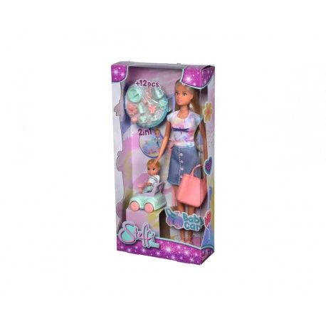 Steffi mit Baby, einem Laufauto, 2 in 1 Funktion, einer Handtasche und weiteren Baby Zubehör, 12-tlg. 29cm, 7cm, WB, 3J+.