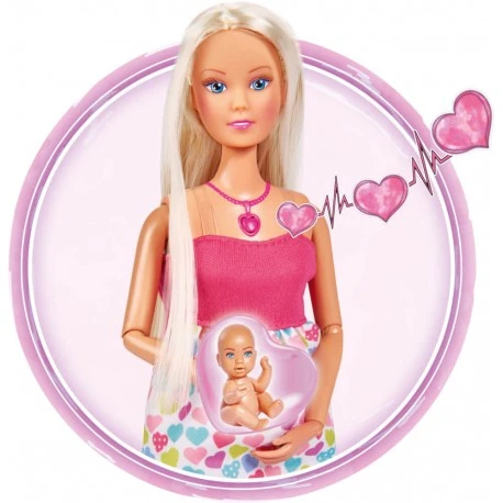 Schwangere Steffi mit Baby und tollen Sounds, Babyzubehör und Babyschale. Try-me Verpackung. Ca. 29 cm. Ab 3 Jahren.