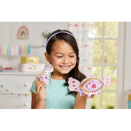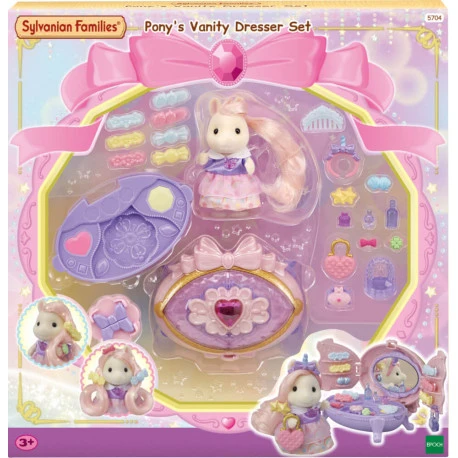 Das Sylvanian Families Schminkkommode mit Pony Figur Spielset bringt Einiges an Spielspaß mit. Die Schminkkommode ist zusammengeklappt eine wunderschöne Schmuckschatulle. Klappt man diese auf, entsteht eine Schminkkommode mit allerlei tollen Accessoires, wie Kamm, Taschen, Haarreif, Parfum Fläschchen und zahlreichem Haarschmuck. Joy, das Pony Mädchen, ist Sallys Schwester. Sally ist die Besitzerin des Friseur Salons in Sylvanian Village. Joy liebt es, sich die Haare zurecht zu machen und trägt gerne verschiedensten Haarschmuck. Ihre langen Haare kämmt sie vor dem Spiegel. Im Sylvanian Families Schminkkommode mit Pony Figur Spielset sind die Schminkkommode, ein Hocker, eine Pony Mädchen Figur mit rosanen langen Haaren zum Kämmen und Stylen, sowie zahlreicher Haarschmuck und Accessoires enthalten. Kopf, Arme und Beine der Figur sind beweglich. Ihre Kleidung kann an- und ausgezogen werden. Die samtig-weiche Figur ist 7 cm groß und für Kinder ab drei Jahren geeignet.