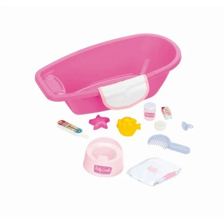 Princess Coralie Badewanne groß mit Zubehör – Geeignet für Puppen bis zu 50 cm – Maße der Badewanne (L x B x H): 50 x 27 x15 cm Set bestehend aus: 1 x Töpfchen, 1 x Lätzchen, 1 x Windel, 1 x Fisch, 1 x Seestern, 1 x Thermometer, 1 x Creme, 1 x Puderdose, 1x Wattepackung, 1 x Schnuller und 1 x Kamm – Geeignet für Kinder ab 3 Jahren – Made in Germany.