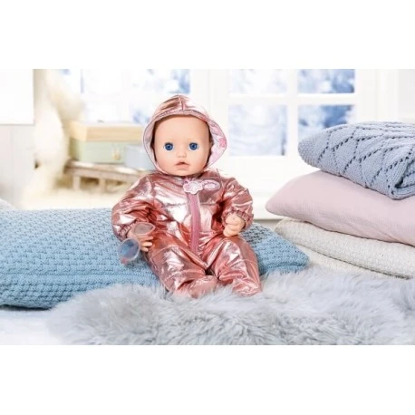 Baby Annabell sitzt mit offenem Mund auf ihrem Schlitten und staunt, wenn die Schneeflocken vom Himmel fallen. Das bitzelt so schön lustig, wenn ein Eiskristall auf die Wange oder die Zunge fällt. Damit die kleine Eisprinzessin nicht friert, bekommt sie ihren Schneeanzug angezogen. Reingeschlüpft, Reisverschluss mit Schäfchen-Anhänger hochgezogen, fertig. Der Overall im top aktuellen Metallic-Look hat angenähte Füßchen und eine Kapuze. Jetzt nur noch die Sonnenbrille aufsetzten, dass der Schnee nicht blendet und schon kann Baby Annabell mit Mama und Papa den Schlittenhügel hinunter düsen. Original Kleidung/Accessoires für die Baby Annabell Markenspielpuppe Das hochwertige Zubehör fördert die Fantasie und bringt neue Spielanregungen und möglichkeiten Baby Annabell Deluxe Set Schneeanzug 43cm aus Overall und Sonnenbrille..