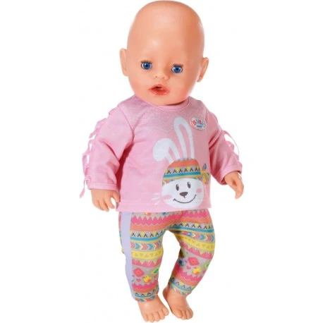 ‚Fransen sind ja sowas von Boho-Style. Die Stoffstreifen baumeln von den Ärmeln des rosa Pullis und flattern verspielt im Wind. Das langärmelige Oberteil ist mit einem weißen Zick-Zack-Muster verziert und Hase Benno strahlt mit typischem Hippie Kopftuch von der Vorderseite. Die kleine Trendsetterin trägt dazu eine Hose mit buntem Ethno-Print und lila Seitenstreifen. Hochwertige Kleidung für die BABY born Markenspielpuppe. Für erweitertes, abwechslungsreiches und langanhaltendes Spielvergnügen. Kinderleichtes An- und Ausziehen. BABY born Trendy Pullover Outfit 43cm aus Shirt und Hose. Inkl. Kleiderbügel.“.