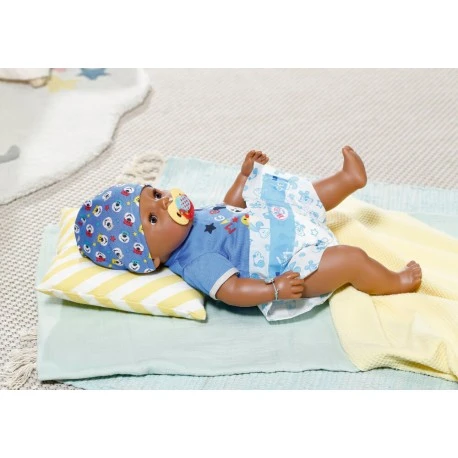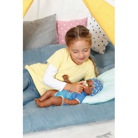 Der Boy hat heute ganz viel erlebt. Er hat nämlich dem Hund vom Nachbarn kennengelernt. Der ist genauso vorwitzig, wie der auf seinem Strampler. Jetzt ist er einfach noch zu aufgedreht um zu schlafen. Gut, dass Oma und Opa einen tollen Trick kennen: einfach den Schnuller im Mund drehen und schon schließt der Boy die Augen. Wenn das beim Babysitten immer so einfach wäre… Durch Drehen des Schnullers öffnet und schließt die Puppe die Augen. Egal in welcher Position sich ihr Körper befindet. Darüber hinaus hat der Boy Schlafaugen. Legt man ihn ohne Schnuller auf den Rücken, schließt er die Augen automatisch. Schlafen, Baden und Essen sind des Boys Lieblingsbeschäftigungen. Er trinkt gerne Wasser aus seinem Fläschchen und kann dann Pipi in die Windel oder ins Töpfchen machen und echte Puppentränen weinen. Neben Wasser steht der BABY born Brei auf dem Speiseplan. Dann macht er sogar sein großes Geschäft. Seine Arme, Beine und der Kopf sind super beweglich, so dass das An- und Ausziehen der coolen Kleidung zum Kinderspiel wird. Der Soft Touch Körper ist angenehm weich. 10 Accessoires, die seine Funktionen unterstützen, ein blauer Body und ein Mützchen gehören zur Erstausstattung. BABY born Magic Mit 10 lebensechten Funktionen für große Spielfreude. Das abwechslungsreiche (Rollen-)Spiel mit BABY born fördert die Fantasie und unterstützt nachweislich die Entwicklung sozialer Fähigkeiten und Werte wie Verantwortung, Kommunikation und Einfühlungsvermögen. Der Schnuller passt jeder BABY born Puppe in 43cm. Die Augen-Funktion des Schnullers geht nur in Verbindung mit BABY born Magic. Benötigt keine Batterien. BABY born Magic Boy 43cm mit Body und Mütze. Inklusive 1 Töpfchen, 1 Windel, 1 Teller mit Löffel, 1 Portion Brei, 1 Flasche, 1 magischer Schnuller, 1 Geburtspass und je 1 Freundschaftsbändchen für Kind und Puppe..
