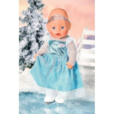 BABY born möchte am liebsten Prinzessin werden, wenn sie groß ist. Und sie mag Eis über alles, egal in welcher Form: Erdbeereis, Eisblumen, Eisbären und die Eishalle. Dort dreht sie schon die ersten Runden auf ihren weißen Schlittschuhen. Für den dreifachen Rittberger muss sie aber noch etwas üben. Wie es sich für eine echte Eisprinzessin gehört, trägt sie ein glitzerndes Kleid, dessen Oberteil an gestapelte Eiswürfel erinnert. Der blaue Dress ist über und über mit Eiskristallen bedeckt. Passend dazu gibt es ein Diadem. Wie schön das kleine Schneeflöckchen im Eisprinzessin Set über die Eisfläche gleitet. Zum Abschluss gibt’s dann immer noch ein Eiskonfekt. Original Kleidung für die BABY born Markenspielpuppe. Erweitert die Spielmöglichkeiten, regt die Fantasie an und fördert kreatives Rollenspiel. Kinderleichtes An- und Ausziehen. BABY born Eisprinzessin Set 43cm aus Kleid, Diadem und Schlittschuhen. Inklusive farblich passendem Kleiderbügel..