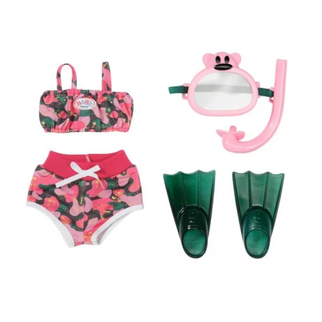 Was ist das denn? Aus dem Wasser des Planschbeckens ragt ein rosa Strohhalm… BABY born ist auf Tauchstation gegangen und das, was man an der Wasseroberfläche sieht, ist der Schnorchel ihrer bärigen Unterwasserbrille. Zur Ausrüstung gehören noch grüne Flossen. Das Grün der Watschelschuhe – so nennt BABY born die Flossen – ist auch im Bikini zu finden. Das geraffte Oberteil und die Shorts sind mit Unterwasserpflanzen bedruckt. Hochwertige Kleidung/Accessoires für die BABY born Markenspielpuppe. Für erweitertes, abwechslungsreiches und langanhaltendes Spielvergnügen. BABY born Weekend Deluxe Tauchspaß 43cm aus Bikini, Tauscherbrille mit Schnorchel und Flossen.