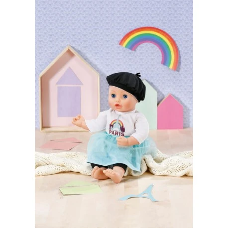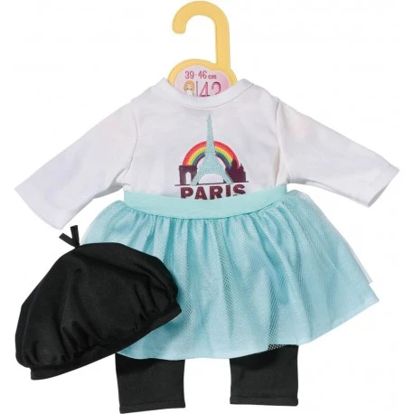 “Klamotten tauschen ist voll En Vogue! Dank des lässigen Schnitts können BABY born, Baby Annabell und andere Puppen in einer Größe von 39-46 cm fröhlich die Kleidung hin und her tauschen. „Bonjour!“ aus Paris. Der Style der französischen Hauptstadt hat seinen Weg – äh, Laufsteg – in den Puppenkleiderschrank gefunden. Der türkise Tüllrock, die schwarzen Leggings und das Shirt mit aufgenähter Stadt-Silhouette kommen direkt aus der Stadt der Mode. Ist das passende Barett nicht genauso so süß wie Cr#pe Suzette? • Original Zapf Creation Kleidung für die Markenspielpuppen BABY born, Baby Annabell und andere Puppen in einer Größe von 39-46 cm. • Für Puppen in einer Größe von 39-46 cm. • Erweitert die Spielmöglichkeiten, regt die Fantasie an und fördert kreatives Rollenspiel. Dolly Moda Paris Look 43cm aus Shirt, Leggings, Rock und Mütze.“.