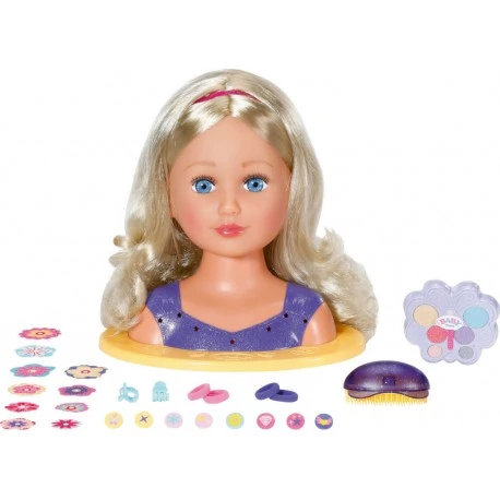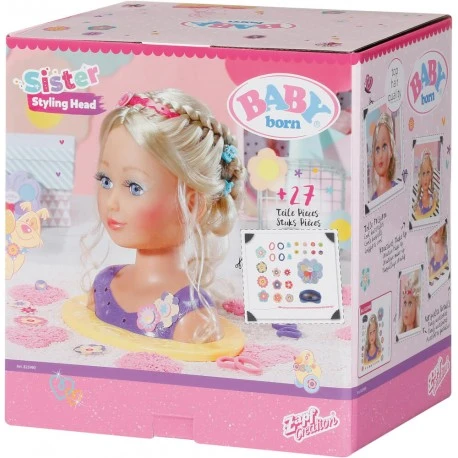 Blumige Styles, farbenfrohes Make Up und grandiose Frisuren Egal, ob wild verstrubbelte Mähne, ordentlich nach hinten gebundener Schopf oder aufwendig geflochtener Zopf, das qualitativ hochwertige Haar ist für alle Frisuren geeignet. 4 Haargummis, 2 Klammern und die Bürste helfen beim Hairstyling. Das pinke Haarband kann in die Frisur integriert und mit Blüten und Pins verziert werden. Die Blumendekoration passt auch prima zum und ans lila Top. Mit der Farb-Palette können kleine Visagisten allerhand Make-Up-Kunstwerke gestalten. Die Farbe ist sogar für Kinderhaut verträglich. Schminken, Stylen und Frisieren. Das abwechslungsreiche (Rollen-)Spiel fördert die Fantasie und unterstützt motorische Fähigkeiten. Für erweitertes und lang anhaltendes Spielvergnügen. BABY born Sister Styling Head mit 27 Accessoires..